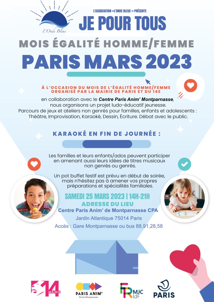 L’équipe de L’Onde Bleue et du Centre Paris Anim Montparnasse animeront toute la journée du 25 mars 2023 de 14h à 21h ,un parcours ludo-éducatif Je pour tous sur le thème du non genré et adressé à tous les publics et familles.